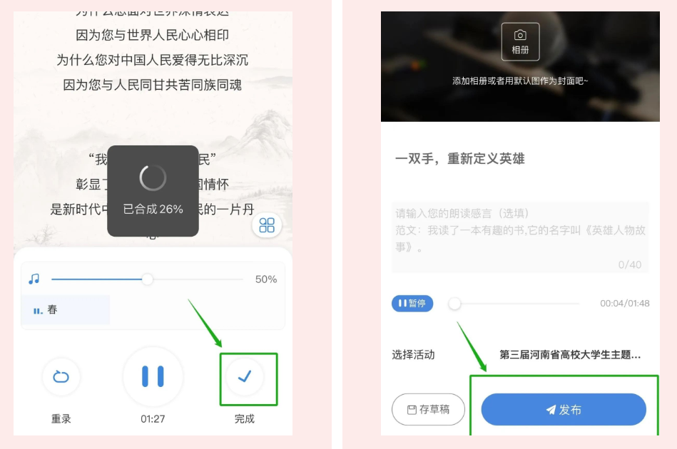 7.提交参赛:朗读完成后,试听人声音乐混合后的作品,如无可点“完成”,再点击“发布”,将作品提交到本次活动中。