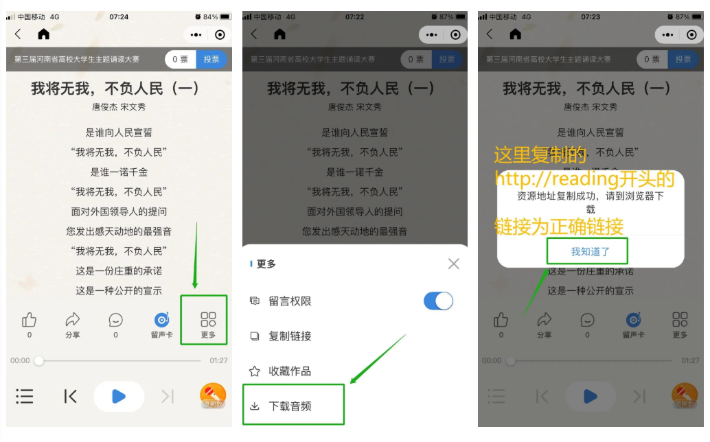 8.报送信息:提交完成后,在“我的作品”里找到相应作品,点击更多,选最下方的“下载音频”,复制作品链接发到任一对话框,(需要是 http://reading 开头的)将个人参赛信息和作品链接一并发给学院或学校的负责老师,获得选拔推荐资格哦。以学院为单位,登记填写后发至图书馆办公室oa。