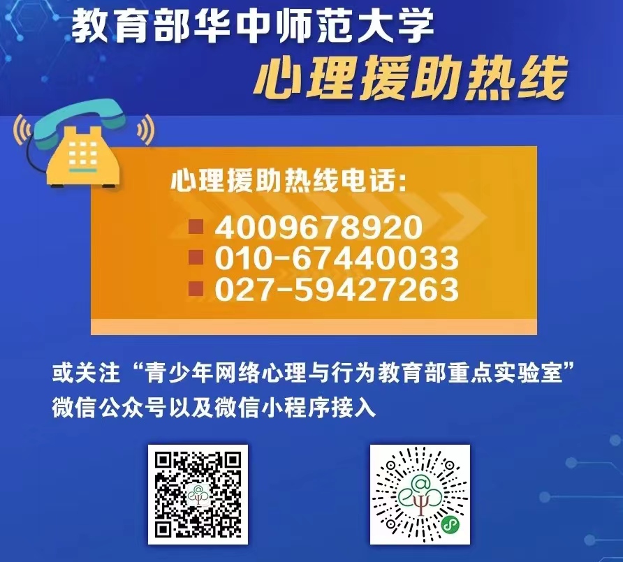 教育部华中师范大学心理援助热线,电话:4009678920;010-67440033;027-59427263(工作时间:8:00-24:00)