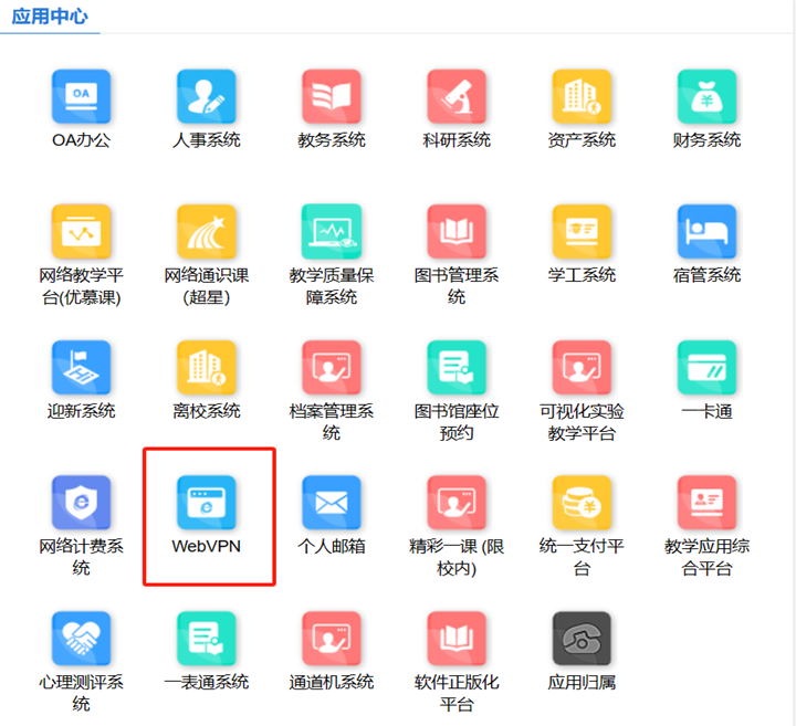 2.登录智慧校园后,在应用中心点进WebVPN。