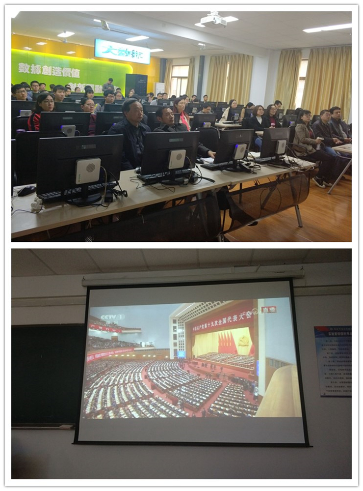 历史的画卷,总是在砥砺前行中铺展;时代的华章,总是在新的奋斗里书写。2017年10月18日上午九点,中国共产党第十九次全国代表大会在北京隆重开幕。信工学院党总支按照学院党委的部署,在资讯楼118组织没课的教师、学生干部和学生集中观看学习了十九大开幕式实况转播。