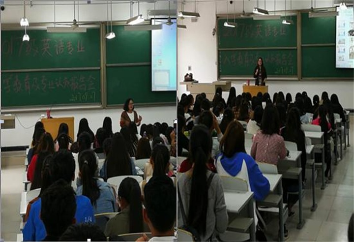 9月27日上午10:30,在时金楼-108,外国语学院英语专业2017级新生入学专业教育隆重举行。活动由教研室主任张丽梅老师主持。