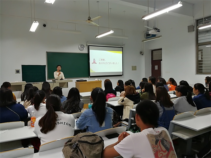 紧接着,洪艳荣老师用“是否能学好日语”和“日语专业将来的就业优势”两个主题引发了同学们的共鸣。洪老师以刚刚结束的首届全国高校大学日语演讲比赛和毕业生的工作情况为例,向同学们介绍了日语学习的各种途径和方法,以及日语专业的就业优势,让他们树立了学好日语的信心。