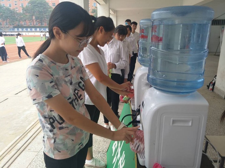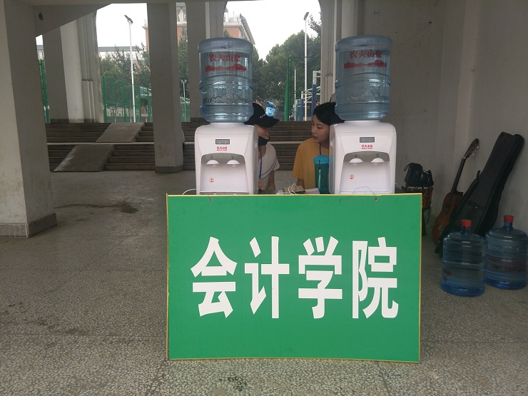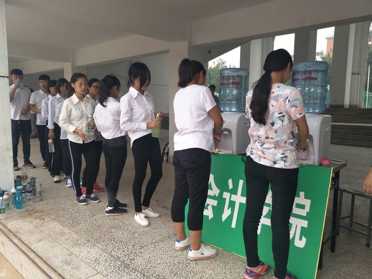 活动开展期间,活动成员来到2017级新生所在的军训位置,设置赠饮地点,为新生们消消暑、加加油,鼓励他们在接下来的军训中锻炼出最好的自己。同时,也让新生们在辛苦的军训时感受到来自会计学院学长学姐们对他们的关心。在新生服务站点,他们总是以最快的速度搬来一桶桶饮用纯净水,确保水能及时供应不短缺,给每一位学弟学妹提供力所能及的帮助。对于新生来说,他们在一个新的环境中,对这里的一切还很陌生,简简单单的一杯水传递了温暖,给予了鼓励。