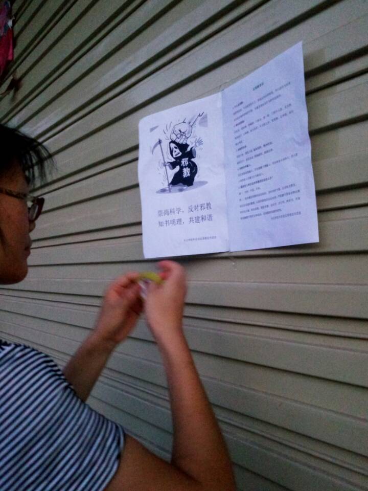 小分队的成员印制了一部分反邪教宣传页,走上街头进行张贴,以便路人了解反邪教的知识,同时,小分队的成员们也给大家分发宣传页。