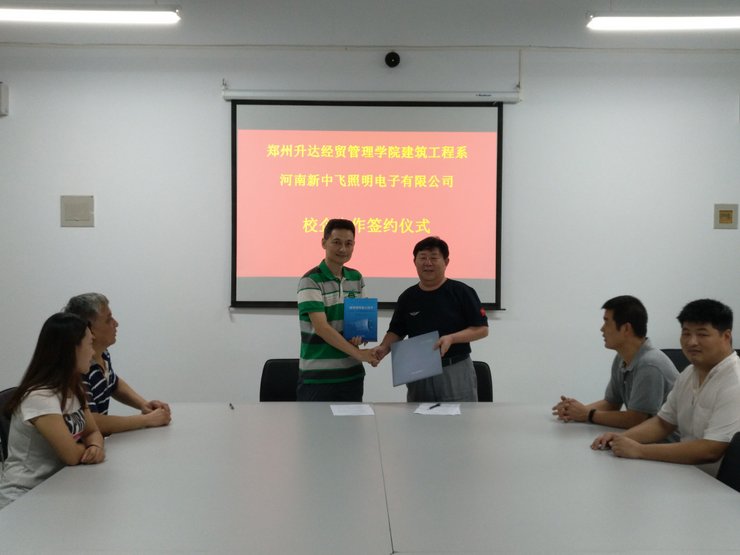 经联系洽谈,我系与河南新中飞照明电子有限公司达成校企合作意向。8月2日上午,在我院实训大楼324会议室,建工系王国际主任与河南新中飞照明电子有限公司代表郑志勇先生签订了产学研合作项目协议。建工系体育系党总支书记韩炎涛同志、建工系孙建超副主任和部分教师代表出席签约仪式。