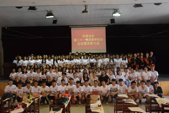 近日,我院外语系在龙湖报告厅举行了第二十一届团委学生会总结暨表彰大会,外语系党总支石皓召书记、外语系行政秘书兼团委书记惠凯赟老师、外语系团委副书记王娟老师,外语系团总支书记崔艳婷老师、田倩倩老师、、武永民老师以及14级、15级和16级各班班长团支部成员、第21届外语系团委学生会全体成员参加了本次大会。整个活动由外语系主持队孙可欣同学主持。