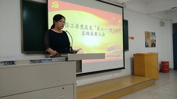 为庆祝中国共产党成立96周年,喜迎党的第十九次全国代表大会顺利召开,推进我系党建工作的顺利开展。628日下午,信工系党总支在资讯楼309教室,隆重举行庆祝建党九十六周年暨七一党建总结表彰大会。我系党总支书记王新平同志,党总支委员、系教学秘书白鑫同志,党总支委员、系行政秘书兼团委书记张娟同志,党总支委员、学生第一党支部书记苗淑娟同志,党总支委员、学生第二支部书记袁奉亚同志分别出席本次大会。我系全体师生党员,预备党员,以及大一、大二所有入党积极分子参加大会。大会由学生党建管理中心承办,由韩雪同学全程主持。