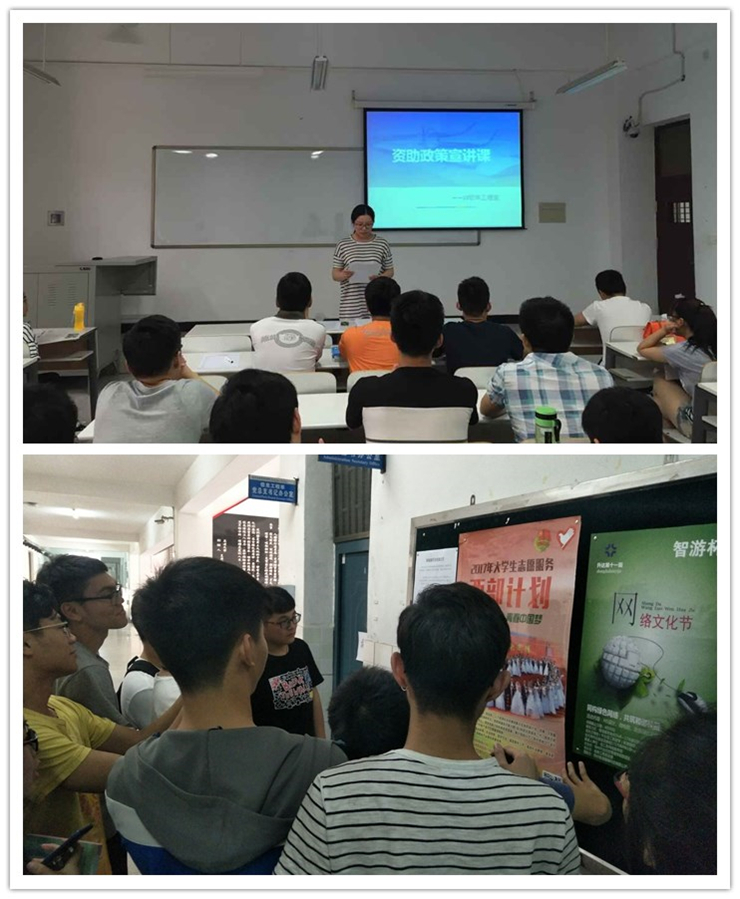 “活动月”主要分为两部分,一为校园地贷款、生源地贷款的申贷、续贷政策宣讲,申贷方法;二为2017-2018年贫困生认定政策解读、考核标准及申请办法。为使我系学生对困难学生资助体系及各项资助政策能够全面了解,从而针对自己的实际情况提出申请并获得资助。在辅导员老师的宣讲下,以班级为单位开展了一系列资助政策宣传教育活动。
