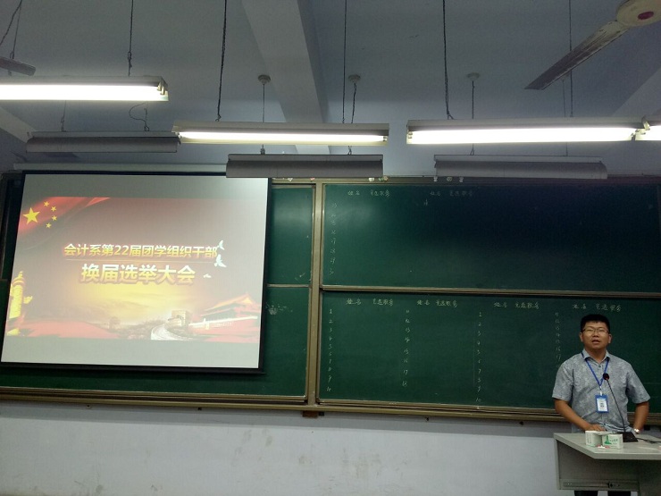 为了使会计系团学会注入新鲜的力量,更好的为同学们服务,6月13日晚6:40,会计系第22届团学组织干部换届选举大会之主席团、部长的竞选会议在教学1号楼111教室如期举行。出席本次会议的嘉宾有:会计系行政秘书兼团委书记陈刚老师、会计系团委副书记安琪、学生会主席安焱焱、社联理事长林佳波、书记助理刘林矗、办公室主任王树玉、学生会副主席常程、学生会副主席张莉、学生会副主席邵鑫鑫、社联副理事长李敏、社联副理事长吕梦凡、社联副理事长姚龙洋。
