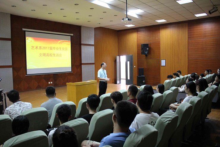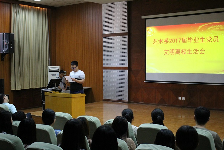 5月31日,艺术系毕业生党支部学生第一党支部在艺术楼105教室召开毕业生党员文明离校会。会议由艺术系第一学生党支部书记王廉廉老师主持,艺术系2017届全体毕业生党员参加了会议,系党总支书记韦杨建同志、毕业生辅导员黄淑珂老师、焦甜老师和蔡长献老师出席了本次会议。
