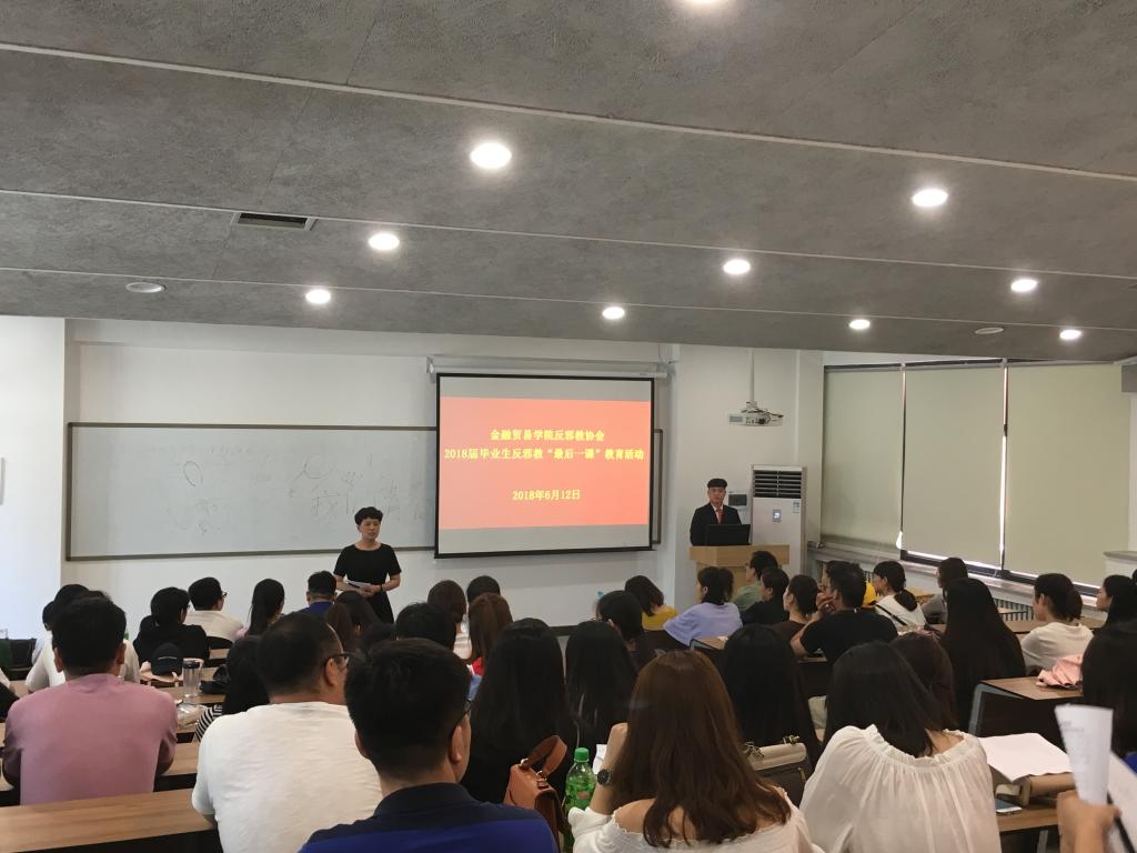 2018年6月12日下午13:30,金融贸易学院党组织在3号楼110教室举行了2018届毕业生反邪教“最后一课”教育活动。金融贸易学院反邪教协会会长钟江鸽老师、反邪教协会李雷老师、毕虹老师、王平老师、崔洋老师、苏鹏老师、王廉廉老师和我院各2018届毕业班学生代表参加了此次活动。