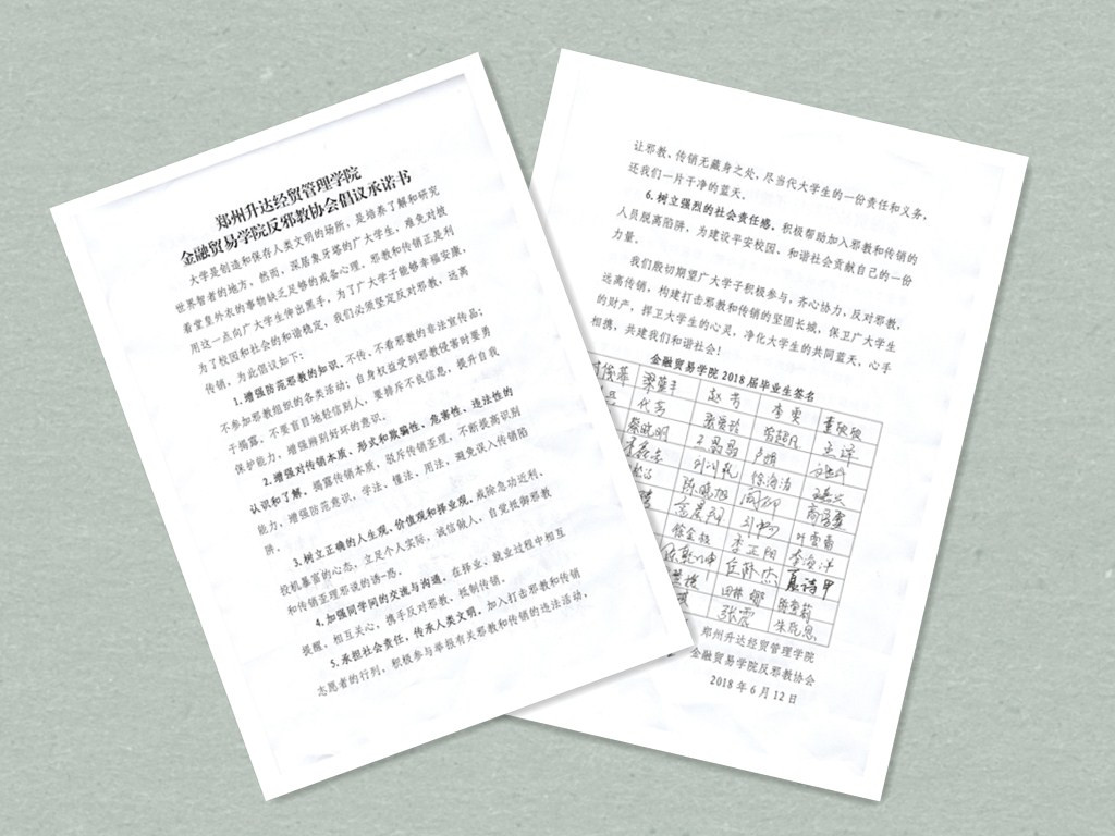 首先,由主持人宣读金融贸易学院反邪教协会倡议承诺书。承诺书倡导大学生增强反邪教防范意识,倡导远离传销,树立正确三观,加强与他人之间的交流并且学会努力承担责任。宣读之后,与会的2018届毕业班学生代表在倡议书上签名。