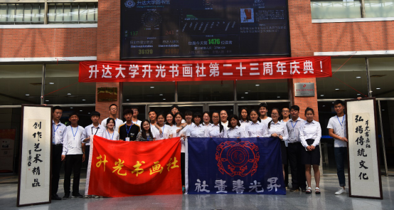 6月9日,升光书画社23周年庆典在图书馆隆重举行,我校公共艺术教研室主任崔怡老师,中国书法家协会会员卢承华老师,升达毕业生代表第6届副社长毕博思和第16届软笔部部长韩冰洁,在校的所有升光书画社成员以及南大学城各高校书画社团参加了本次活动。