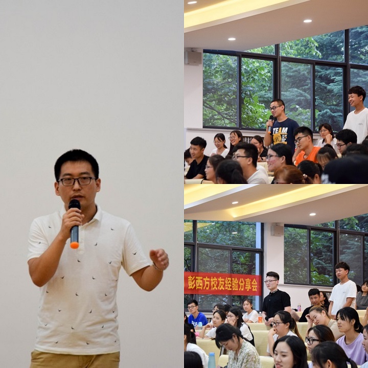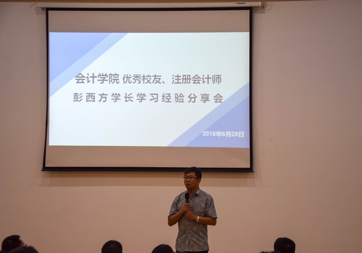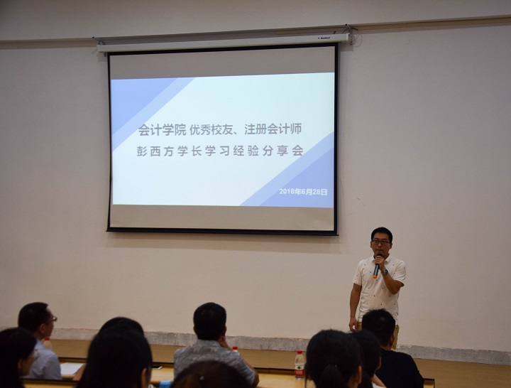 为了帮助即将面临未来方向选择的同学们更好的选择合适的方向,对以后的社会实践和工作有全面了解,并帮助同学们规划在校学习计划。6月28日下午7:00,会计学院优秀校友、注册会计师彭西方学长经验分享活动于教学4号楼118教室举行。出席此次活动的嘉宾有:现任方正证券投资银行部业务副总裁、会计学院优秀校友彭西方学长,会计学院行政秘书兼团委书记陈刚老师。