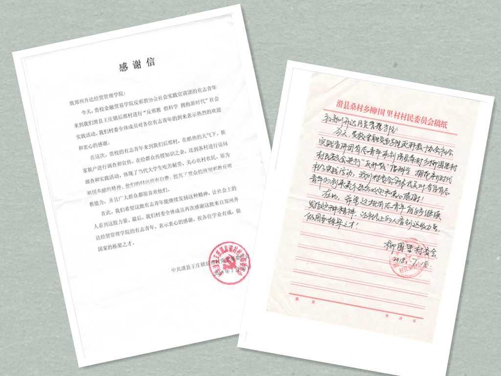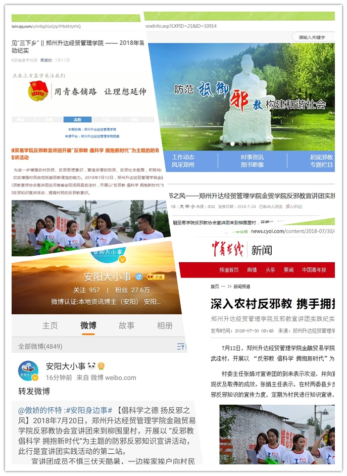 “反邪教 倡科学 拥抱新时代”团队队长白晨旭表示:今年暑假期间,团队成员不畏炎热的“三伏天”,深入基层街头村巷,为群众宣传防渗反邪知识,团队成员无私奉献,也得到多个实践当地村委的高度评价。在暑期实践中,中国青年网、河南省团委学校部、郑道网、今日头条、网易等多家媒体对团队进行报道,取得良好的社会效应。