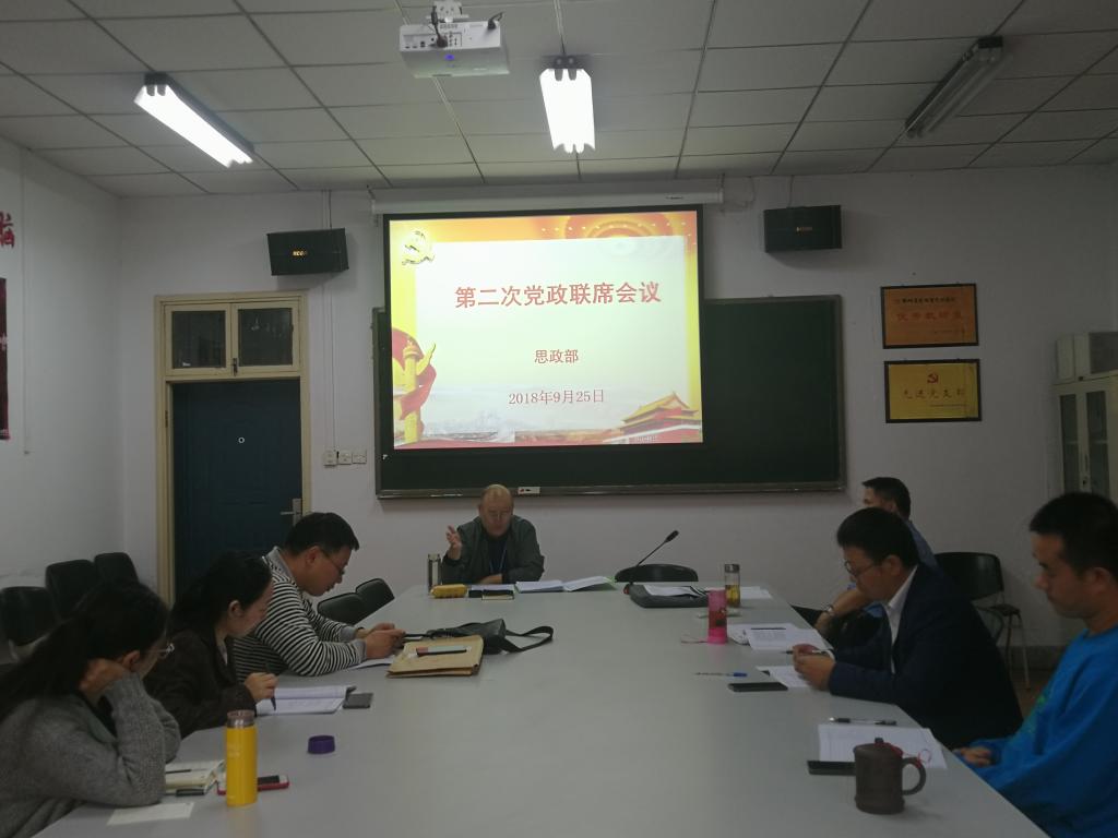 9月25日上午,思政部在综合楼211会议室召开党政联席会议,思政部主任朱慈华教授、党支部书记窦峰副教授、教学秘书晏玲玲及各教研室主任参加。