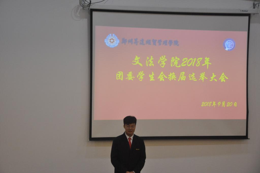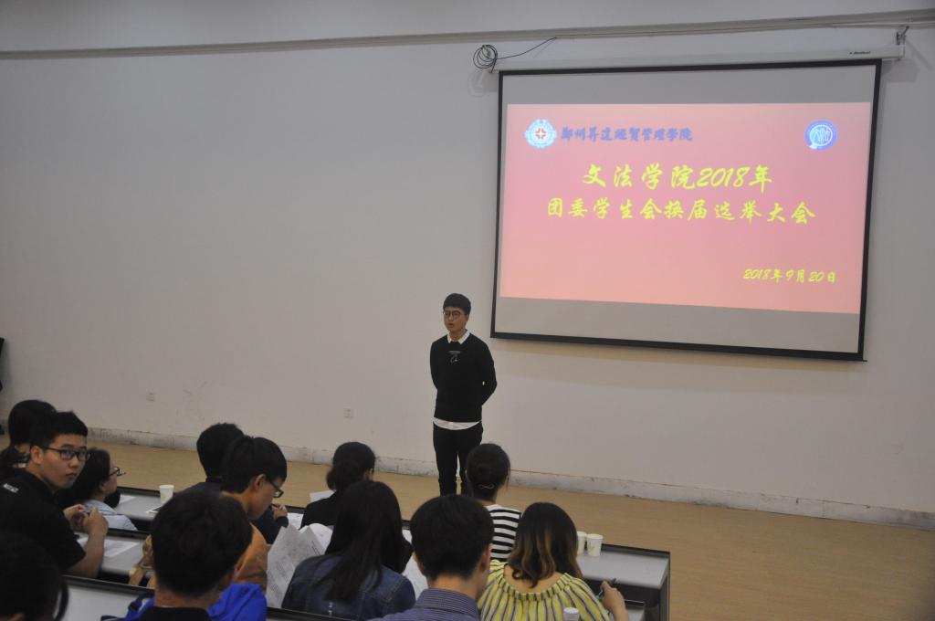 为给文法学院团委学生会注入新鲜血液,按照校团委的统一工作部署,文法学院团委于9月11日至20日开展了团委学生会干部换届工作。9月20日晚6点30分,文法学院团学干部选举大会于1号楼118教室举行。出席本次大会的嘉宾有团委书记郑玲玲老师、团委副书记张明奇老师、17级团总支书记王松洁老师、17级辅导员王卫丽老师以及第17届主席团全体成员。