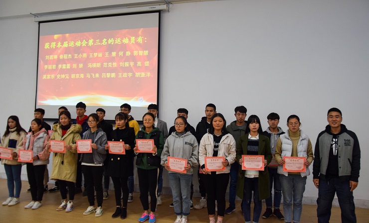 随后,由陈刚老师、刘锦老师和杨煜老师三位老师分别为这次比赛的第一名,第二名,第三名颁奖并合影留念。最后,由上届田径队队长刘欣介绍田径队的队史,并且对参加即将到来的冬季越野赛和春季运动会的会计学子们给予厚望。