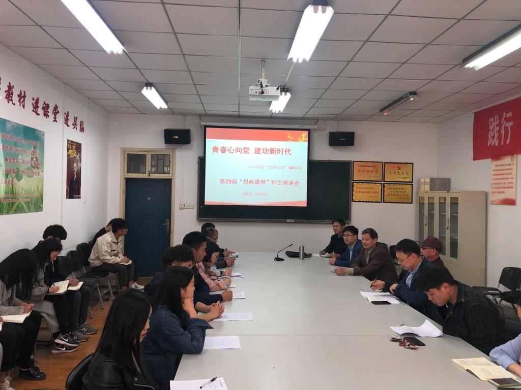 4月25日下午,在综合楼211会议室,思政部根据第29届“思政课活动周”方案,组织了“青春心向党,建功新时代——纪念五四运动100周年”师生座谈会,校团委书记李霄锋、思政部直属党支部书记窦峰以及部分教师、学生代表参加。座谈会由窦峰书记主持。