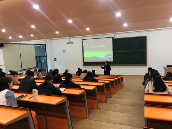 2021年4月12日下午,商学院白朋飞副院长在教学2号楼116教室,为全体教职工讲授“中国共产党发展历程”专题党课。