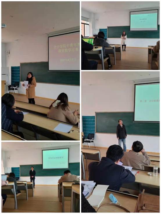 4月7日,会计学院在教学四号楼208教室举行了“会计学院中青年教师课堂教学比赛”决赛,由会计学院副院长毕鹏翾老师主持,评委由会计学院校级教学竞赛获奖教师和评教成绩优异的副教授组成,分别是闫本宗、郭小钰、吴冉、马会娟和赵颖等老师。参赛教师分别是:周锋、王瑞云、肖晓、王丰、曾景伟、陶慧芳和郭苏敬等老师。每位参赛教师都精神饱满,教学内容充实,教学方法灵活,理论联系实际,将课程思政与专业知识有机融合,教学效果良好。通过评委评比,最终确定由郭苏敬、曾景伟和肖晓三位教师代表会计学院参加学校的中青年教师课堂教学比赛。