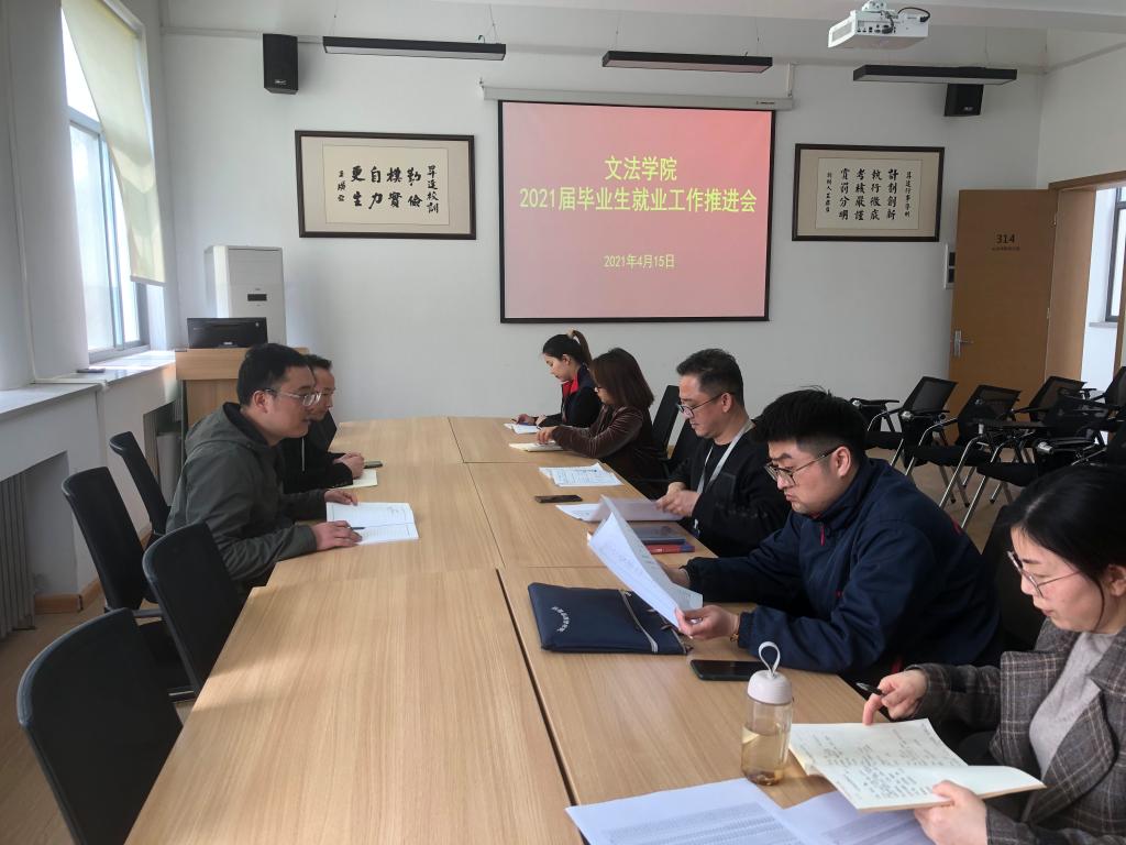 4月16日中午,文法学院在教学1号楼314召开2021届毕业生就业工作推进会,文法学院党总支书记刘晓川主持会议,副院长赵严俊、各教研室主任、就业专员及毕业班辅导员参加会议。