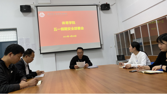 为迎接“五一”小长假来临,落实学校对学生假期安全教育及管理工作方面的要求,提高我院学生的安全意识,保证学生安全愉快的度过小长假,体育学院于4月28日下午在体育馆会议室召开五一劳动节假期安全教育部署会。学院党总支书记杨明志、行政秘书兼团委书记高建涛以及全体辅导员参加了本次会议。