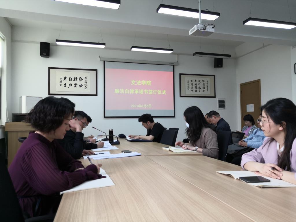 会议最后,由院长段丰乐、书记刘晓川、副院长赵严俊带头,全体教职工依次签订《文法学院教职工廉洁自律承诺书》。(供稿人:张喜超)