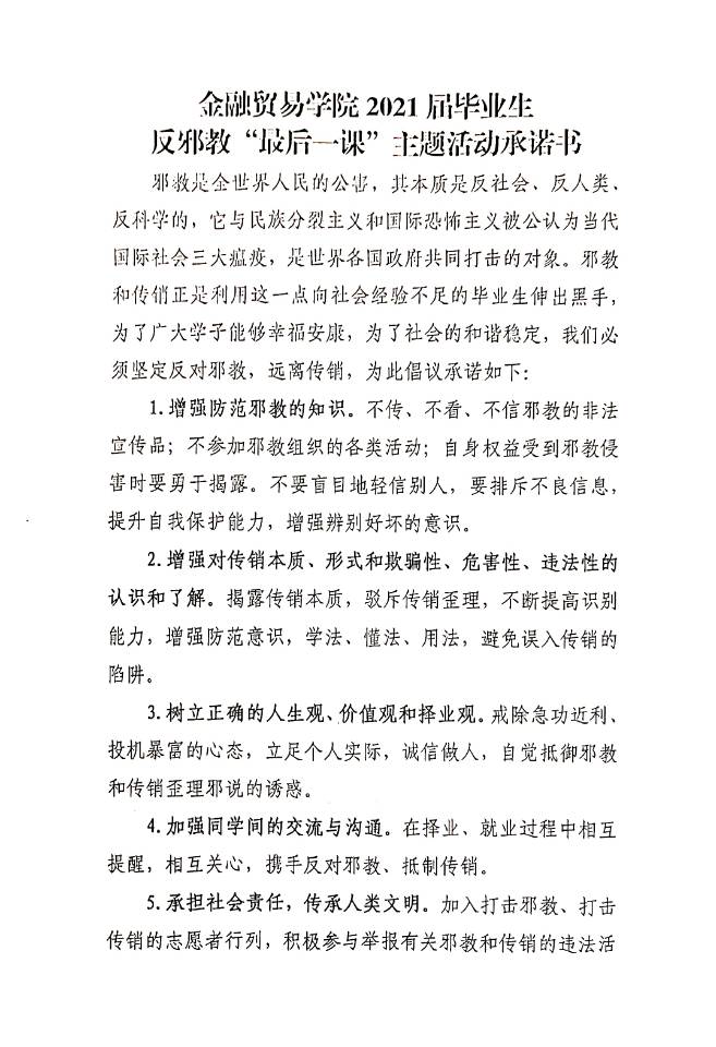 由主持人宣读金融贸易学院2021届毕业生反邪教“最后一课”主题活动承诺书。承诺书倡导大学生反对邪教、共同维护社会稳定,端正思想意识,把握正确三观,自觉抵制邪教,提高辨邪、识邪、防邪的能力。宣读之后全体在场人员依次在承诺书上签名,并集中观看中国反邪教制作出品的《动漫:关爱家人,拒绝邪教》,动漫中展现了邪教对家人所造成的巨大危害,让同学们深刻的认识到邪教的特点和辨识方法,增强了对邪教的防范意识。