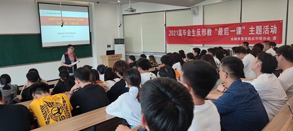 为进一步落实学校反邪教工作“四课”教育,使学院广大毕业生对邪教有更多更深入的了解和认知,进一步增强他们识邪、辨邪、防邪、拒邪、反邪的能力,营造健康和谐的校园氛围和社会风气。在学院毕业生毕业答辩之际,2021年5月11日下午,金融贸易学院反邪教协会在教学3号楼210室开展了2021届毕业生反邪教“最后一课”主题活动。金融贸易学院反邪教协会李雷老师和各毕业班学生代表参加了此次活动。