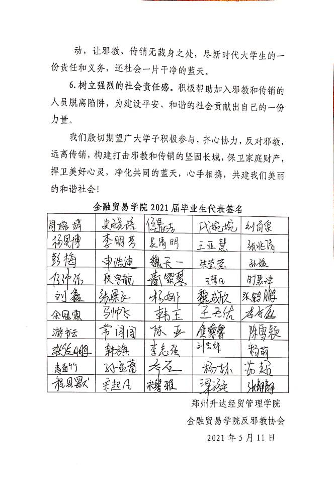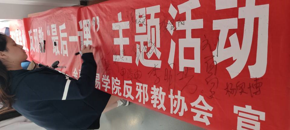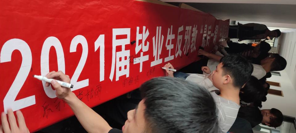 最后,组织2021届毕业生反邪教“最后一课”签名仪式,邀请毕业生代表在专题条幅上签名,并合影留念。