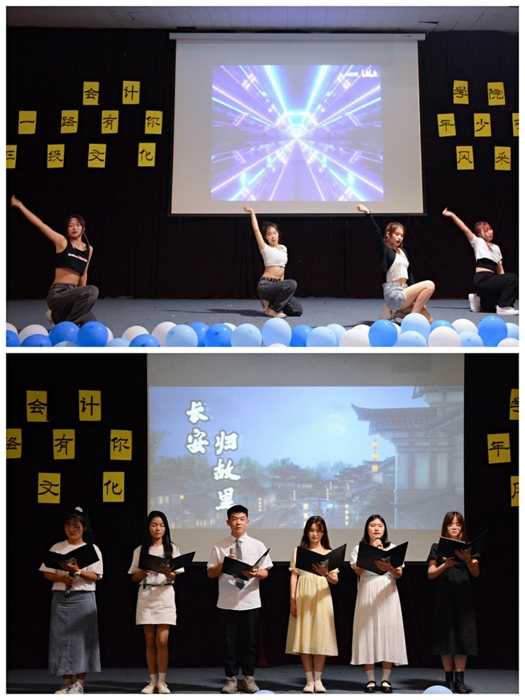 本场晚会分为上下两场,上半场为“展青春之风”,下半场为“亮活力之彩”。上半场“展青春之风”由18级会本4班,20级财管3班、会专2班和会本5班等选送的开场舞蹈《咆哮+gashina》拉开序幕,调动起了现场的气氛,给观众们带来了视觉与听觉上的震撼。接下来是由19级会本10班选送的歌曲《嘉宾》,开启了全场的大合唱;由20级会本2班,会专3班和会专6班带来的《追梦青春》,将观众带回了那段热情澎湃的青春时光;由20级会专1班以及会专7班带来的说唱《星球坠落》,让同学们感受到歌词中爱情的甜蜜;舞蹈《Yes,OK!》动感的舞姿和节奏展现了会计学子的青春活力与魅力,使全场气氛达到高潮;最后以会计学院演讲队带来的朗诵《长安归故里》结束了上半场的篇章。