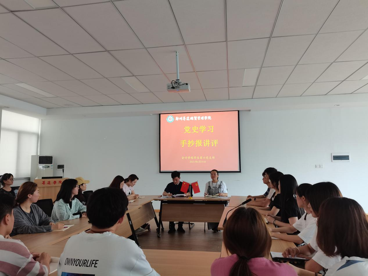 2021年6月10日16:30,会计学院学生第六党支部在教学四号楼209开展“学党史守初心”手抄报讲评主题党日活动。参加本次会议的有党支部书记王岩峰老师、组织委员杨柳老师、宣传委员杨煜老师,以及会计学院学生第六党支部的学生党员。大会由支部书记王岩峰老师主持。