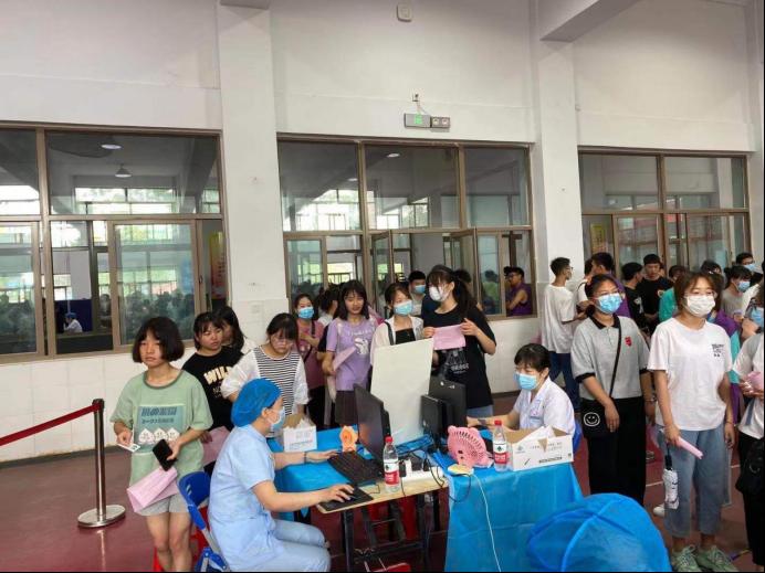 集中接种现场设置有多个接种区,并且设置留置观察,完成疫苗接种的学生们将会在此休息观察。在登记区,医务人员详细确认每个学生的个人信息,并告知疫苗接种的相关事项,学生按照流程有序完成疫苗接种,现场秩序井然。