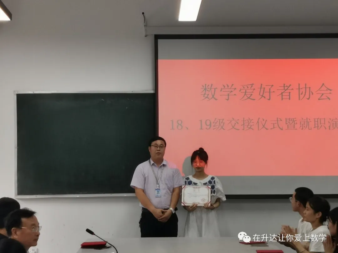 最后,由新一届会长王中原、秘书长王玉茹、副会长李沈阳、副会长华镜宇做就职演讲。他们分别叙述了自己对以后工作的规划,并都表达了日后要把协会做大做强的决心,希望更多的人加入数学协会,走进数学,爱上数学。