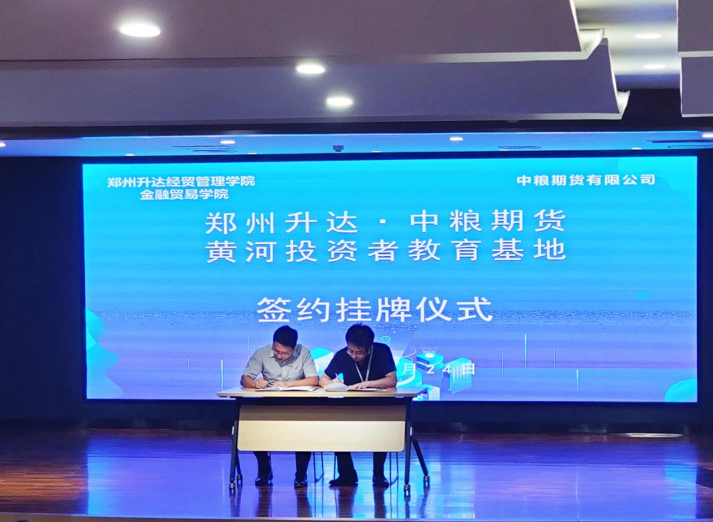 6月24日下午,郑州升达·中粮期货黄河投资者教育基地签约仪式在实训楼双创的大讲堂隆重举行。出席签约仪式的有中粮期货有限公司执行董事胡斌、副总监马阳光、高级经理余卓远,我校金融贸易学院行政秘书王娟、教研室主任李光举、实训中心主任王宇鹏、校企合作专员李珺、教师温子奕及学生代表。