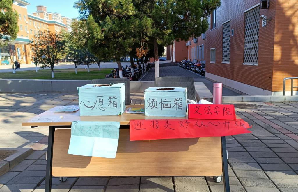 本次活动自12月1日正式开始,活动期间由同学们写下便利贴,可以选择投入“烦恼箱”分享自己的心事,满足同学们表达和倾诉的心理需求;也可以选择投入“许愿箱”表达自己对未来的期许。以鼓励同学们积极生活,珍惜当下;还设置有“答案箱”,同学们在生活中遇到纷扰繁杂的小事犹豫不决的时候,可以来此抽取其中的纸条,为其提供意见建议,同时安排学生干部和有心理学知识背景的老师及时为同学们答疑解惑。