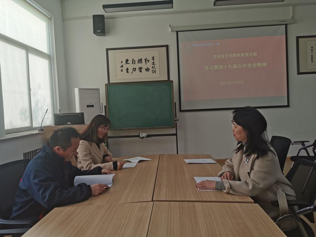 汉语言文学教研室党支部于12月9日召开了十九届六中全会精神专题学习会。会议由党支部书记汪梁主持,支部全体党员参加。