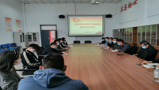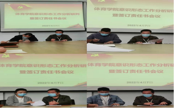 为贯彻落实上级关于意识形态工作的决策部署,及时分析意识形态领域出现的新情况、新问题,根据意识形态工作制度,4月7日下午,体育学院在校教师和辅导员在体育馆208会议室举办体育学院意识形态工作分析研判暨签订责任书会议。