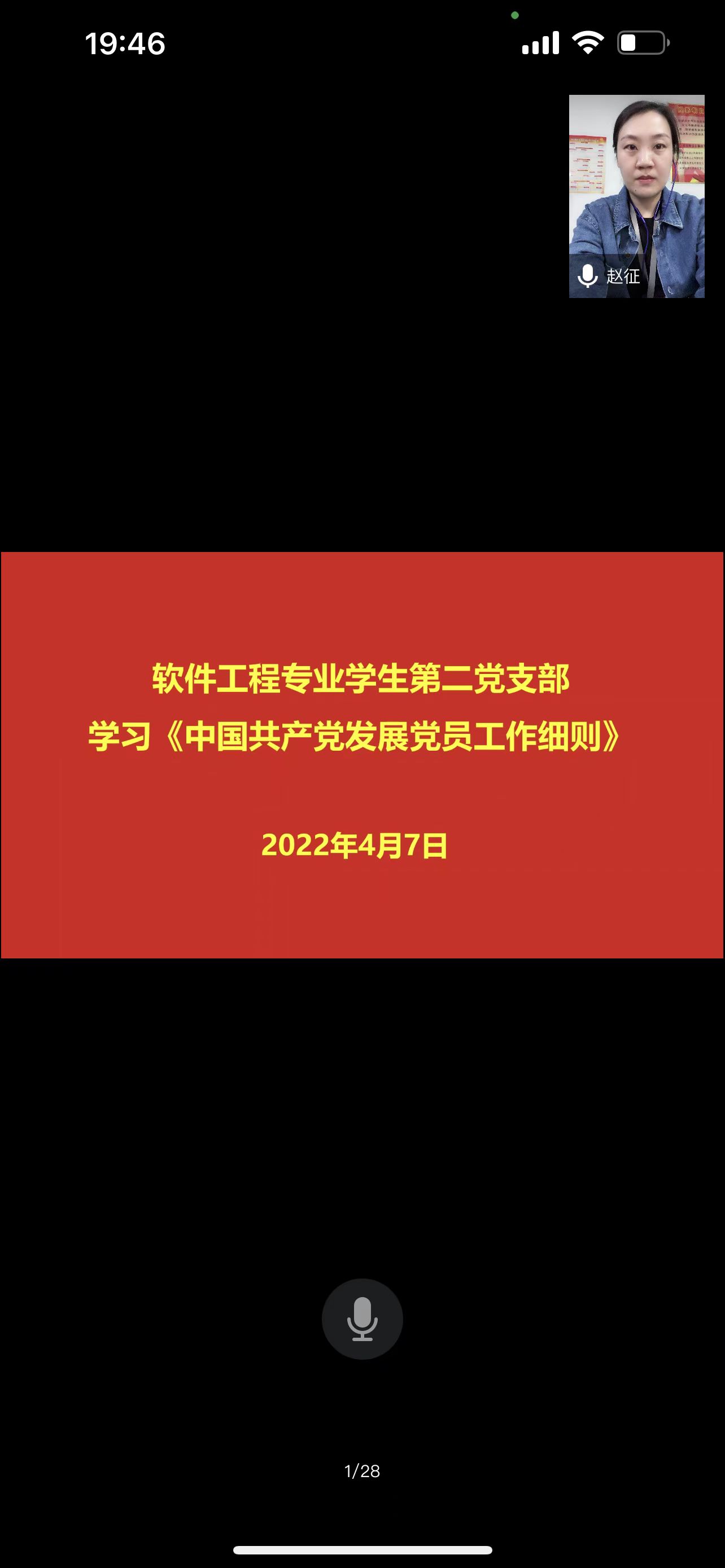 为进一步加强新形势下党员发展及教育管理工作,4月7日晚,信息工程学院软件工程学生第二党支部召开线上会议,学习《中国共产党发展党员工作细则》。会议由支部书记赵征主持,支部全体党员、预备党员、积极分子参加会议。