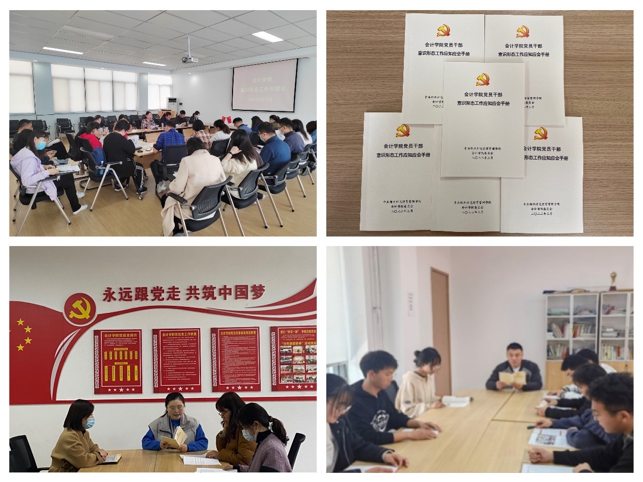 3月10日-17日,全院各党支部传达学院意识形态工作制度,落实任务部署,组织师生党员学习习近平总书记在全国宣传思想工作会议上的重要讲话、习近平总书记在学校思想政治理论课教师座谈会上的重要讲话,《中国共产党宣传工作条例》《会计学院意识形态应知应会知识手册》等内容,充分认识到意识形态工作的极端重要性。