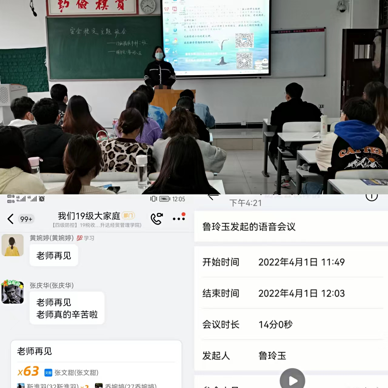 疫情就是命令,防控就是责任,在4月1日,学校被划为管控区后,会计学院辅导员鲁玲玉老师第一时间召开线上主题班会传达目前学校的防疫政策,安抚学生情绪,叮嘱班委和宿舍长发挥网格化管理的作用,积极掌握学生在校动态和学生心理状况。管控后按学校要求第一时间返回校园,舍小家,为大家。