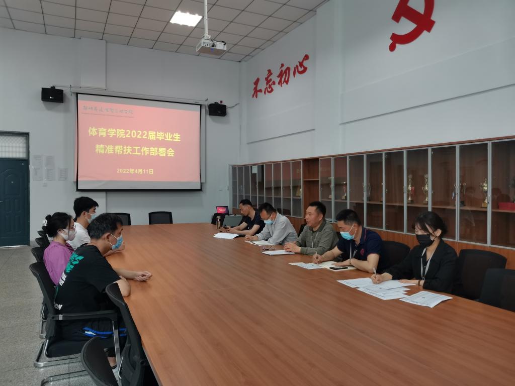 为做好疫情防控常态化形势下的毕业生就业工作,4月11日下午,体育学院在体育馆会议室召开2022届毕业生就业精准帮扶工作部署会。学院党总支书记杨明志、院长张王利、行政秘书高建涛、体舞教研室主任栗元辉、就业专员康晓晨以及部分在校的就业困难学生参加了会议。