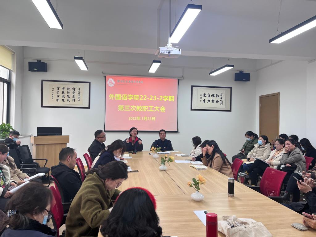 2022年3月24日下午,外国语学院2022-2023学年第二学期第三次教职工大会在外国语学院会议室206举行。会议由崔瑾英院长主持,院党委书记石皓召同志、教学秘书祁胜利、行政秘书丁玥及全体教职工参加了会议。