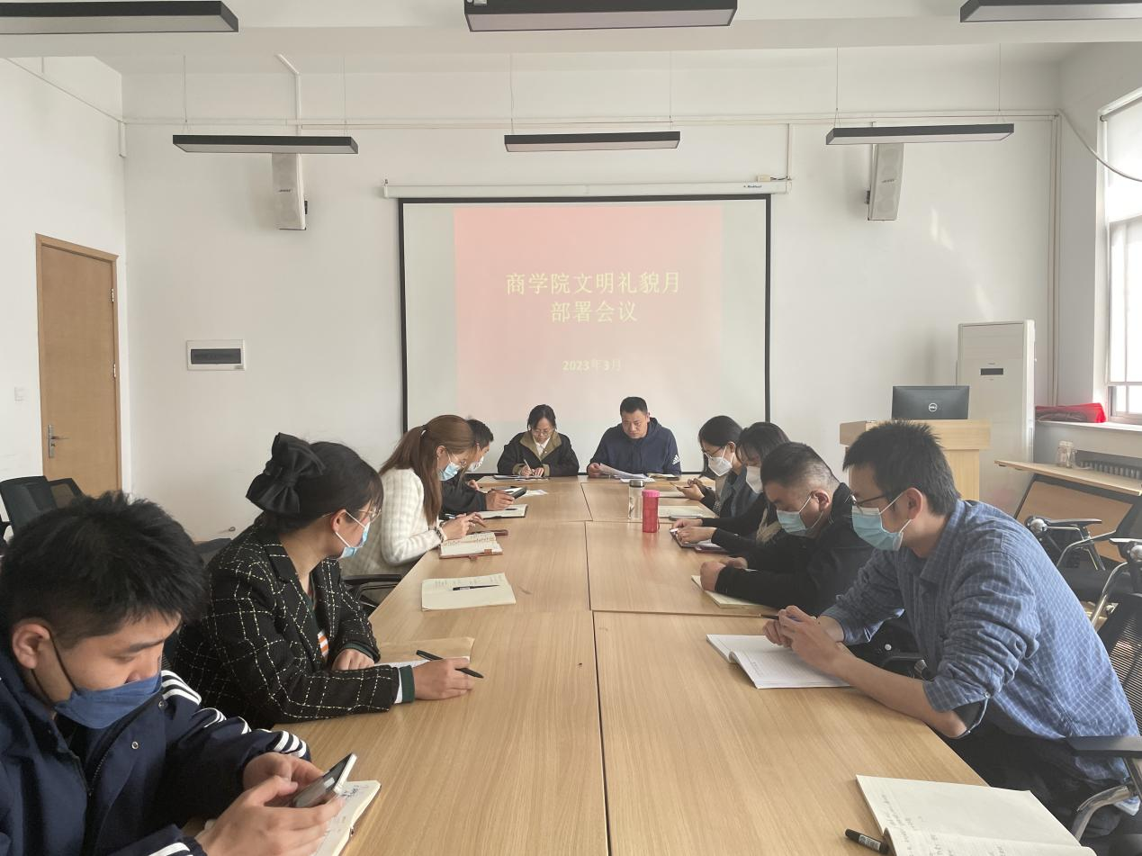 为进一步落实学校关于本学期文明礼貌月活动的相关安排,营造积极向上、文明礼貌、舒适优雅的校园文化环境,2023年3月28日下午商学院在教学二号楼315会议室召开了文明礼貌月再部署会议。学院党委书记郭峰、行政秘书郗艳花及全体辅导员参加了会议。