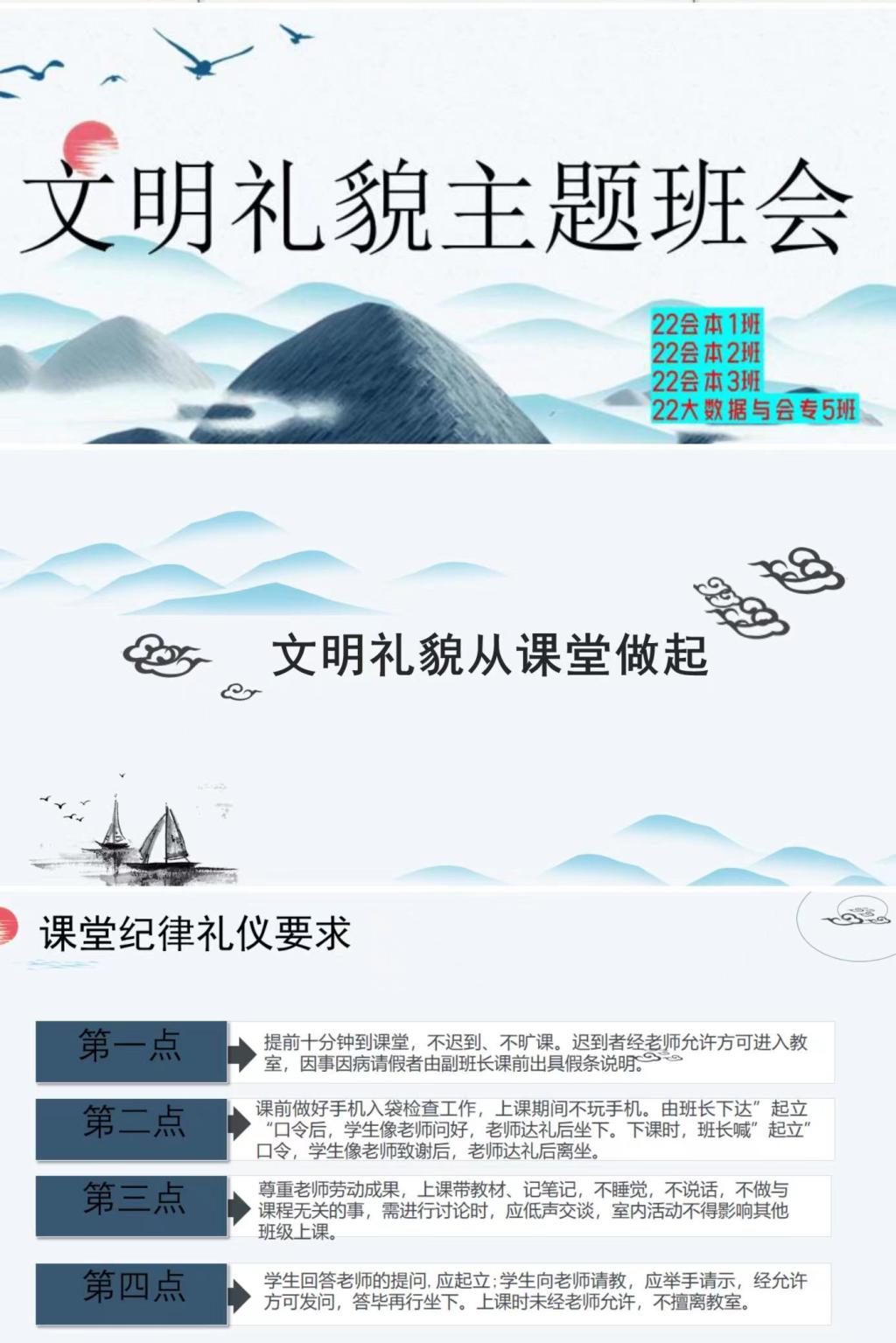 活动围绕公共文明礼仪教育、文明课堂、文明举止等方面展开,前期召开“文明礼貌月”主题动员班会,运用网络会议PPT的形式,让同学们更加直观地了解文明礼貌相关内容。