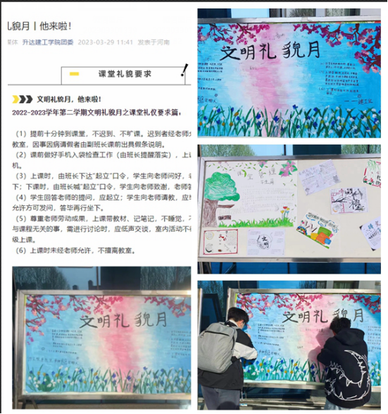 为践行创办人育人理念,普及课堂礼仪知识,强化课堂礼仪规范,建工学院积极响应学校号召,于3月21日-30日认真做好文明礼貌月宣传动员活动。