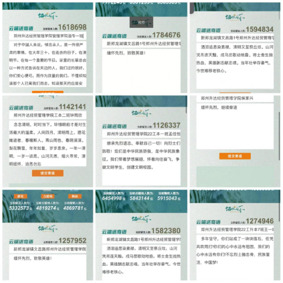 管理学院组织学生进入“云”端留言致敬、缅怀先烈。“上和无氧,烟火寻常,清明缅怀,追思勿忘”、“缅怀先烈,致敬英雄”、“你们的心中永远有祖国,我们的心中永远有你们”......无数管理学院的学生通过云端表达自己对先烈崇高敬意。