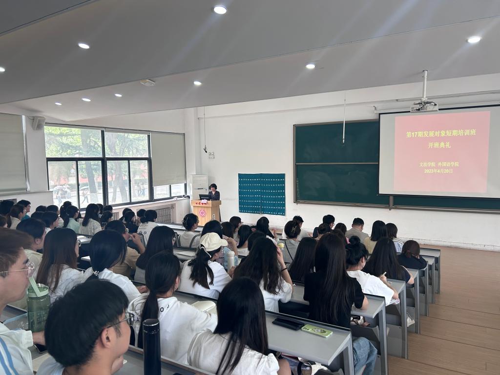 4月20日中午,文法学院和外国语学院在教学1号楼118会议室召开第17期发展对象短期培训班开班典礼,文法学院党委书记刘晓川、党委组织委员郑玲玲、党委统战委员李南方、外国语学院组织委员丁玥、文法学院组织员金东亮以及两院第17期发展对象参加会议,会议由文法学院党委组织委员郑玲玲主持。